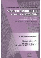 PEŘINKOVÁ, Martina. Výzkum dlouhodobé účinnosti sanačních omítek na historických objektech: zkrácená verze habilitační práce v oboru Teorie konstrukcí a staveb : pro jednání Vědecké rady FAST-TU Ostrava konané dne 28.11.2008. Ostrava: Vysoká škola