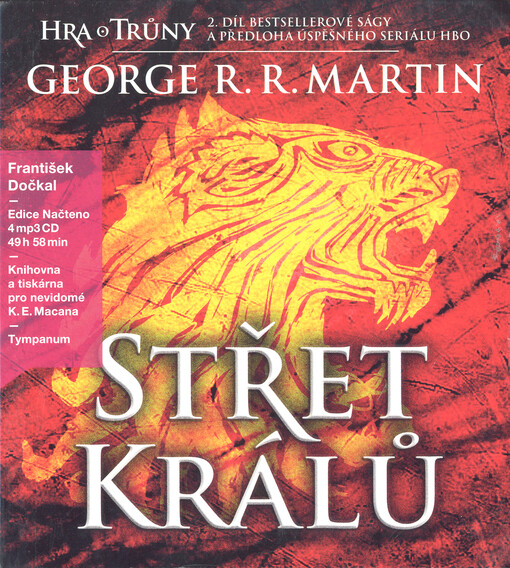 MARTIN, George R. R. Střet králů: [2. díl bestsellerové ságy] [zvukový záznam]. Překlad Hana BŘEZÁKOVÁ. [Praha]: Tympanum, 2014. 4 zvukové desky (49 hod., 58 min.). Načteno.