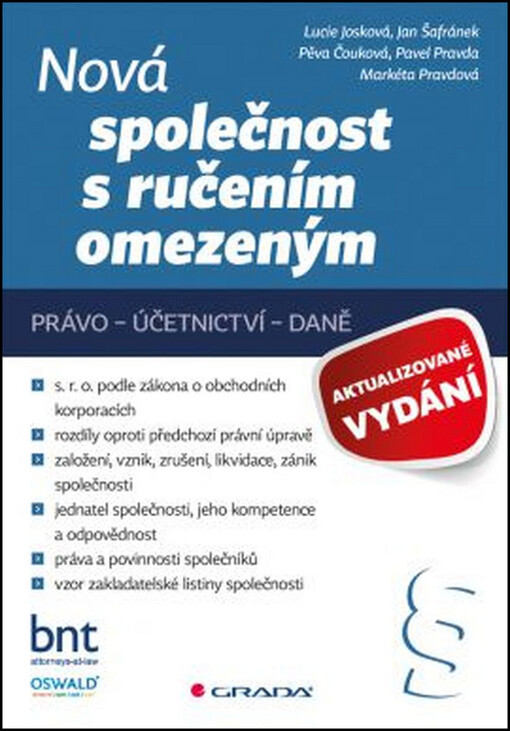 JOSKOVÁ, Lucie. Nová společnost s ručením omezeným: právo, účetnictví, daně. Aktualizované vydání. Praha: Grada Publishing, 2015. 232 stran. Právo pro praxi.