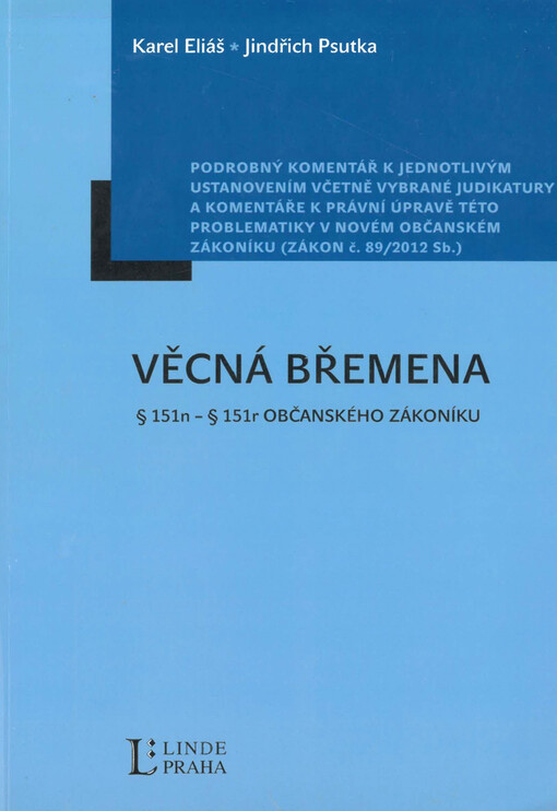 ELIÁŠ, Karel a Jindřich PSUTKA. Věcná břemena: § 151n - § 151r občanského zákoníku : podrobný komentář k jednotlivým ustanovením včetně vybrané judikatury a komentáře k právní úpravě této problematiky v novém občanském zákoníku (zákon č. 89/2012 Sb.).