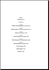 Publikace připomíná Michelangelův odkaz na poli plastiky, malby, architektury i básnictví, jeho tvorbu zasazuje do širokých kulturně-historických souvislostí. Text doprovází množství barevných reprodukcí a fotografií.