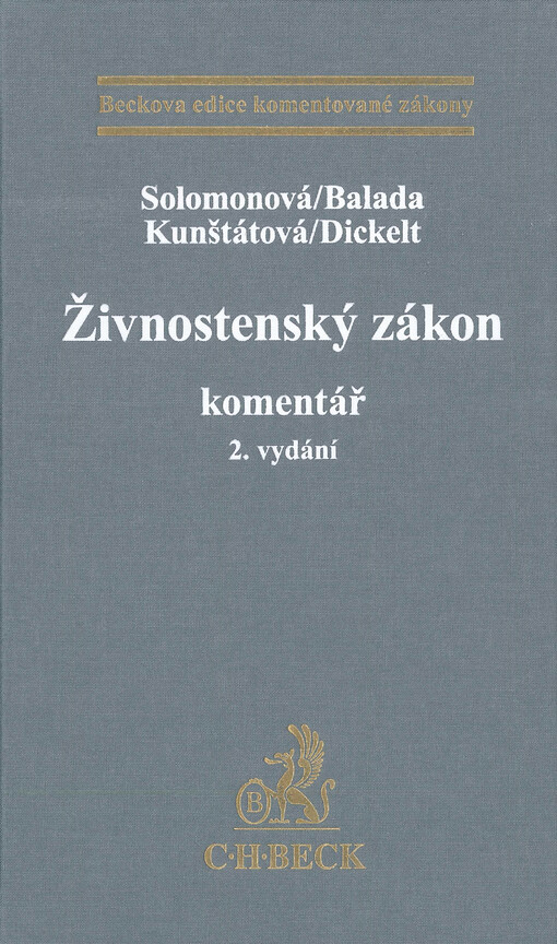 SOLOMONOVÁ, Kristýna. Živnostenský zákon: komentář. 2. vydání. V Praze: C.H. Beck, 2023. xxvi, 618 stran. Beckova edice komentované zákony.