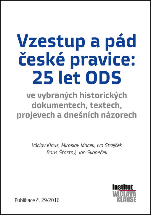 KLAUS, Václav. Vzestup a pád české pravice: 25 let ODS: ve vybraných historických dokumentech, textech, projevech a dnešních názorech. Vydání první. Praha: Institut Václava Klause, 2016. 94 stran. Publikace, č. 29/2016.