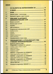 Tato kniha je zaměřena na popis a ukázky praktických použití mikrořadičů ATMEL AVR typů: AT90S1200, AT90S2313, AT90S2343, AT90S4433, AT90S8515 a AT90S8535. Pozornost je věnována především typu AT90S2313, který bylo možné pořídit za rozumnou cenu (do 100 Kč) a vyniká relativně vysokým počtem zabudovaných periferií. Jsou však uvedeny i aplikace mikrořadičů AT90S2343 (levný typ v 8vývodovém pouzdře) a AT90S8535 (nejvíce vybavený typ). Všechny mikrořadiče se vyznačují RISC architekturou (zajistí vysoký výpočetní výkon), velkým počtem pracovních registrů a hlavně možností sériového downloadu (podporuje programování přímo v navrhované aplikaci; značně zjednodušuje vývoj aplikací). Nejdříve je proveden stručný popis vlastností jednotlivých mikrořadičů a AVR architektury včetně sériového downloadu. Tento popis je zakončen návodem na stavbu SDK kitů (programátorů - vývojových desek) pro mikrořadiče AT90S2313 (AT90S1200), AT90S2343 a AT90S8535. Zájemce si na podobném principu může sestavit vlastní programátory pro ostatní dva typy mikrořadičů. Následuje uvedení programátorského modelu, instrukční sady a programování za pomoci direktiv překladače AVR 3.1. Další kapitoly přinášejí klasické aplikace AVR (řízení skupiny LED, 7segmentového LED displeje, LCD displeje a maticové klávesnice) a ukazují použití obvodu SAA1064 (budič 4místného 7segmentového LED displeje ovládaný sběrnicí I2C). Následuje popis přerušovacího systému a zdrojů resetu. Je ukázáno praktické použití zabudovaného obvodu Watchdog. Velká pozornost je věnována použití čítačů/časovačů. Jedná se o obsluhu displeje s časovým multiplexem, měření kmitočtu, PWM regulaci, použití pro A/D a D/A převody. Další kapitola popisuje možnosti sériového kanálu a připojuje 3 aplikace řízené programy, které pracují pod operačním systémem Windows 95 a vyšším (univerzální 8bitový vstupně/výstupní port; impulzní generátor; generátor programovatelných průběhů). Následuje kapitola, která je věnována otázce měření fyzikální veličin (především napětí). Jsou uvedeny příklady použití zabudovaného analogového komparátoru (spojeno s čítačem pracujícím v režimu Input Capture), čítače (mezipřevodem na kmitočet), externího A/D převodníku MCP3002 a zabudovaných A/D převodníků (pouze u typů AT90S8515 a AT90S8535). Poslední kapitola se věnuje zbývajícím rysům AVR. Jedná se o ukázku použití paměti E2PROM, SPI kanálu a režimů snížené spotřeby. V příkladech jsou použity přípravky popsané v knihách: Práce s mikrokontroléry AT89C2051 a Práce s mikrokontroléry AT89S8252 (tyto knihy však nezbytně nepotřebujete, vždy je uveden krátký popis vysvětlující funkci a konstrukci přípravku). Dále jsou publikovány nové přípravky, které především demonstrují možnosti zabudovaných periferií AVR.