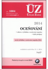 Tato publikace obsahuje zákon o oceňování majetku po změnách souvisejících s rekodifikací soukromého práva. Zcela nová je oceňovací vyhláška, jejímž předmětem je oceňování pozemků, staveb (budovy, haly, rodinné domy, rekreační a zahrádkářské chaty, chalupy, inženýrské stavby, bytové jednotky, garáže a další), oceňování práva stavby, trvalých porostů a oceňování majetkových práv. V edici ÚZ dosud vyšly předpisy z oblasti oceňování pod č. 71, 106, 156, 169, 230, 293, 363, 416, 484, 596, 654, 711, 778, 815, 868 a 931. Toto č. 1004 se od č. 931 liší v předpisech zvýrazněných v obsahu tučně. Obsah publikace: Zákon č. 151/1997 Sb., o oceňování majetku a o změně některých zákonů (zákon o oceňování majetku) Přehled oceňovací vyhlášky Vyhláška č. 441/2013 Sb., k provedení zákona o oceňování majetku (oceňovací vyhláška) Sdělení MF čj. 162/38 024/1999, k oceňování práv odpovídajících věcným břemenům Sdělení MF ze dne 27.2.2001, k oceňování práv odpovídajících věcným břemenům v souvislosti s vydáním zákona č. 103/2000 Sb.