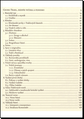 Georg Trakl byl rakouský lyrický básník, jehož díla tvoří základ rakouské poezie 20. století. Předkládané vydání první básníkovy publikované sbírky Básně (Gedichte) uvádí kromě českého převodu jeho textů i německý originál.Německý text byl korigován podle nejnovějších kritických vydání, nově pořízený český překlad se snaží o maximální možnou obsahovou a formální věrnost. Úvodní studie rozebírá básníkovu poetiku a některé okolnosti jeho života, které silně ovlivňují interpretaci básní a literární i lidský obraz jejich autora. Detailní komentář všech básní, v traklovském bádání ojedinělý, se zabývá hlavně kompozicí básně a jejích částí, syntaktickými, gramatickými a interpretačními zvláštnostmi a nejasnostmi, zvukovou stránkou veršů a jejich paralelami v tvorbě Trakla a jiných autorů. Slovo překladatele srovnává traklovské překlady v různých evropských jazycích a tradicích a objasňuje aktuálně použité zásady a postupy. Publikace je doplněna strukturovanou bibliografií a konkordancí básní z Gedichte s jejich pozicemi v hlavních traklovských edicích.