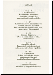 Rozhovory o tématu společenské odolnosti z různých úhlů pohledu.Kniha filosofky a literární dokumentaristky se zabývá tématem společenské odolnosti, a to prostřednictvím série rozhovorů s osobnostmi současné české společnosti, jako jsou Klára Šimáčková Laurenčíková, Simona Bagarová, Anna Kárníková, Eva Fraňková, Adriana Světlíková, Zuzana Čepelíková, Daniela Vodáčková, Benedikt Vangeli, Pavla Holcová, Lukáš Houdek, Alica Sigmund Heráková, Saša Uhlová, Kateřina Šimáčková, Pavel Houdek a Jiří Šedivý. Autorky s respondenty a respondentkami společně otevírají témata krize, sociální změny, systémových opor, strategií zvládání nenadálých událostí, sociálních vazeb, hodnot nebo kultury s přihlédnutím k tématu odolnosti, a to v rámci oblastí psychologie, ekonomie, práva, vzdělávání, obrany, médií, péče, ekologie, sociální práce, vztahu k menšinám, dezinformací, kultury, genderových témat či tématu nenávistných projevů.