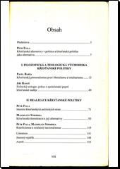 OBSAH: PETR FIALA: Křesťanské alternativy v politice a křesťanská politika jako alternativa -- PAVEL BARŠA: Křesťanský personalismus proti liberalismu a totalitarismu -- JIŘÍ HANUŠ: Politická teologie: pokus o společenské pojetí křesťanské naděje -- PETR FIALA: Identita křesťanských politických stran -- MAXMILIÁN STRMISKA: Křesťanská demokracie a její alternativy -- PETR FIALA, MAXMILIÁN STRMISKA: Katolicismus a současný nacionalismus. 1. vydání.