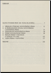 Jedná se o výpisky ze 6 statí mapujících převážnou problematiku ve výzkumu novověké paleografie. Tyto statě se jmenují Přehled výzkumu novověkého písma, K problematice studia novověkého latinského písma, Názvosloví novověkých písem (stať je opatřena grafickým přehledem vývoje systémů názvosloví), České novogotické písmo, Školní písmo v Čechách a Tajná písma novověku (stať je rozšířena o poznatky z knihy Piper, Murphy - Kryptografie).