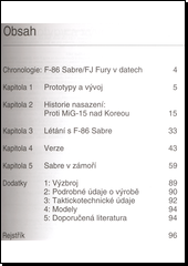 Publikace podává vyčerpávající informace o technických údajích, kompletní operační historii a letových vlastnostech proudového stíhacího letounu druhé generace F-86 Sabre