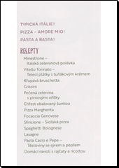Kdo by nemiloval Itálii – a kdo by nemiloval italskou kuchyni!? Je lehká, voňavá, chutná a při vyslovení několika kouzelných slovíček – jako olivový olej, parmezán, rajčata, ricotta – se člověku hned začnou sbíhat sliny. Italská kuchyně je jistě nemyslitelná bez pizzy a pasty, tato kuchařka však přináší i mnohé další pokrmy, které k ní neodmyslitelně patří. Vyzkoušejte třeba minestrone, scaloppine al limone, focacciu, gnocchi al limone, lahodné tiramisu nebo jihotyrolský štrúdl.