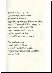SEATTLE. Jsme částí země: řeč náčelníka Seattlea k prezidentu Spojených států amerických v roce 1855. 1. vyd. Přeložil Radka NEUŽILOVÁ. Brno: Zvláštní vydání, 1993, 36 s. S sebou, sv. 7. ISBN 80-85436-24-8.