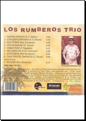 MANGO MANGUE (F. F. Valdés) - CORAZÓN ESPINADO (F. F. Olvera) - BEZÚTĚŠNÁ (Petr Smetáček) - VEN PA BAILAR (D. Torres) - CHAN CHAN (F. Repilado) - ME CANSE DE TI (G. Cárdenas) - AUTODROM (Petr Smetáček) - CANCIÓN DEL MARIACHI (C. Rosas) - bonus track: POLIBEK (Petr Smetáček) LOS RUMBEROS TRIO je nejmladším a – co do počtu členů – také nejmenším přírůstkem do rodiny kapel sestavených Petrem Smetáčkem. Stejně jako v případě svých větších příbuzných (LOS RUMBEROS a LOS RUMBEROS EN GRANDE) je základem repertoáru afro-kubánská hudba (tedy „salsa“), navíc zde hojně doplněná o známé „latino“ evergreeny a jazzověji laděné skladby. Jádrem tělesa je DUO Petra Smetáčka a Jana Buriana, jejichž multi-instrumentální dovednosti umožňují plnohodnotnou interpretaci latinsko-amerických rytmů i v tomto komorním obsazení. Do TRIA, eventuelně KVARTETA a KVINTETA, si pak k sobě zvou špičkové zahraniční interprety z Kuby a Peru, kteří dodávají kapele tu pravou exotickou příchuť. Nejinak je tomu na tomto CD, které prezentuje všechny zmíněné varianty komorní odnože LOS RUMBEROS. Obsazení:Petr „El Pulpo“ Smetáček (CZ): piano, foot-claves, kick, lead vocals (4, 5), background vocal (6), coros; trumpet (2, 8); percussion (congas, campana, güiro, maracas etc.); band leader, Jan „Juanito“ Burian (CZ): guitar, tres, foot-campana, hi-hat, lead vocals (2, 5, 6, 8), coros, Maria Victoria Calero (Kuba): flute (1, 4, 5); coros, maracas & güiro (5), Vlado Urlich (Peru): quena (3, 7), quenacho (9), trumpet (3, 5); coros, Carlo Zegarra Abanto (Peru): cajon (2), bongos & congas (5), coros