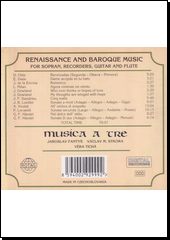 Musica a tre (hudební skupina). Renaissance and baroque music for sopran, recorders, guitar and flute [zvukový záznam]. Praha: Rotag, 1993. 1 zvuková deska (70:07).