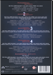 DVD 1. Paranormal activity. Mladý pár ze střední vrstvy se nalézá v budově, která vypadá jako typický předměstský dům větších rozměrů. Postupem doby si oba protagonisté začínají uvědomovat zvláštní tíseň, která se brzy mění v upřímný a opravdu nefalšovaný strach. Za všechno může přítomnost něčeho, co je - a nebo také není - doslova démonické, ba ďábelské. Ale ať už mají hlavní hrdinové co dočinění s čímkoli, nejaktivnější je to během noci. DVD 2. Paranormal activity 2. Tento snímek je považován za hororový vrchol. Duchařský příběh zvládne jen ten skutečně nejotrlejší. Hlavní roli zde hrají kamery, které mají znepokojeným majitelům ukázat, co nekalého se děje v jejich domově, když spí. Lze předpokládat, že šílenější domácí video si lze představit jen těžko. V prvním díle tvůrci využili osvědčenou metodu pseudoreálných záběrů, když záznam kamery prezentovali jako nalezený materiál. Do stejné řeky podruhé vstoupit logicky nemůžou, ani nechtějí, přesto Oren Peli tvrdí, že klíč k uchopení příběhu, který použili, nabízí mnohem děsivější možnosti. A protože příběh je až do premiéry filmu přísně střeženým tajemstvím, nezbyde než se přesvědčit na vlastní smysly. DVD 3. Paranormal activity 3. I kvůli maximálnímu požitku z filmu zůstává jeho příběh bedlivě střežen. Prozradit lze snad jen to, že v něm znovu vystupují hrdinky předchozích dvou dílů, paranormálními aktivitami pronásledované sestry Katie a Kristi, s nimiž se vrátíme ke kořenům zla, do doby jejich dětství, kdy se rády strašily a vyvolávaly duchy, až se jim to jako bumerang začalo vracet. Připravte se na drsný a nekompromisní filmový zážitek, který nenechá nikoho v klidu. Snad kromě hrdinů filmu, kteří se s paranormálními aktivitami setkají na vlastní kůži. DVD 4. Paranormal activity 4. Příběh hororu Paranormal Activity 4 volně navazuje na druhý díl, v němž zběsilá, démonem posedlá Katie vyvraždila rodinu své sestry s výjimkou nemluvněte Huntera, které unesla neznámo kam. Po pěti letech se tahle dvojice s velice pohnutou minulostí přistěhuje na poklidné americké předměstí, které záhy pohodové být přestane. Paranormální sílu na vlastní kůži pocítí především matka s dcerou, které sousedí s Katie. Po prvních divných a nevysvětlitelných událostech instalují v domě kamery a další bezpečnostní prvky a nestačí se divit tomu, co na nich uvidí. Jenže u toho se hrozivé a temné síly, které se nad získávají moc, nezastaví. DVD 5. Paranormal activity. Prokletí. Jesse (Andrew Jacobs) právě dostudoval střední školu a ocitl se na prahu nudného volna. Během zoufalého hledání rozptýlení uslyší z větrací šachty podivný hluk z bytu o patro níž. S kamarádem „pošlou na průzkum" zapnutou videokameru, která zaznamená nevšední rituál. Z bizarního se stane děsivé, když obyvatelka onoho bytu náhle zemře a vzhledem k přítomnosti policistů na místě činu rozhodně ne přirozenou cestou. Policejním páskám navzdory se kluci rozhodnou sousedčin byt prohlédnout. Jako připomínku si Jesse z expedice odnese podivné kousnutí, po kterém už jeho život nikdy nebude stejný jako předtím. Stejně tak jako životy těch, kteří se mu budou snažit pomoci. Do té doby fádní a nezajímavý osud hlavního hrdiny se vinou jeho zvědavosti nečekaně protne s tragickou historií postav předchozích dílů