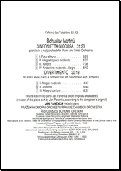 Sinfonietta Giocosa pro klavír a malý orchestr, H. 282 1 Poco Allegro 8:26 2 Allegretto Poco Moderato 6:27 3 Allegro 7:37 4 Andantino Moderato, Allegro 8:42 Concertino (Divertimento) pro klavír levou rukou a komorní orchestr, H. 173 5 Allegro Moderato 4:47 6 Andante 6:40 7 Allegro Con Brio 8:37 Pražský komorní orchestr (řídí - Bohumil Gregor) Jan Panenka - klavír