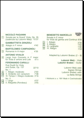 Formát: CD, Album Žánr: Classical Skladatelé: • Antonio Vivaldi (tracks: 4) • Bartolomeo Campagnoli (tracks: 3) • Benedetto Marcello (tracks: 5,6,7,8) • Fernando Carulli (tracks: 9,10,11,12,13) • Giambattista Grazioli (tracks: 2) • Niccolò Paganini (tracks: 1) Účinkují: Guitar – Lubomír Brabec Violin – Lubomír Malý