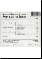 SPERGER, Johann Matthias. Symphonies for strings [zvukový záznam]. [Bratislava]: Trevak, [1992]. 1 CD audio (68:41).