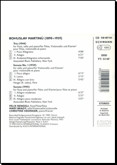 MARTINŮ, Bohuslav. Trio (1944) for flute, violoncello and piano: für Flöte, Violoncello und Klavier ; Sonata no. 1 (1939) for violoncello and piano = für Violoncello und Klavier ; Sonata (1945) for flute and piano = für Flöte und Klavier [zvukový záznam]. [S.l.]: Koch Schwann Musica Mundi, 1990. 1 CD (53:40).