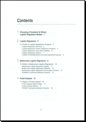 This manual is divided into two sections. The first section provides a guide to the various statistical techniques available with SPSS Regression Models and how to obtain the appropriate statistical analyses with the dialog box interface. The second is a syntax reference guide that provides complete command syntax for all the commands included in the Regression Models option. Statistical procedures in this module include: multinomial logistic regression, binary logistic regression, non-linear regression, two-stage least squares, probit, and weighted least squares.