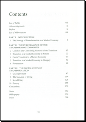 The transformation provisions have brought about a replacement of the planning system by a capitalist system. This change engendered many positive results, but at high social costs. Some of the costs, as a dramatic decline in output and decline in the standard of living have been transitory, but some as unemployment, widening of income inequalities, weakening of social programmes and expansion of poverty are a permanent feature of the new system. The focus of this book is on social costs of transformation. It examines the active employment policy and its effect. Great attention is devoted to the reforms of pension and health care system. It analyses the reasons for the expansion of poverty and the chances of reducing it. The book also discusses the performance of the economies of the subject countries and gives a critical evaluation of privatisation, primarily of the Czech voucher privatisation.