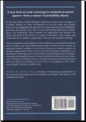 A new look at weak-convergence methods in metric spaces-from a master of probability theory In this new edition, Patrick Billingsley updates his classic work Convergence of Probability Measures to reflect developments of the past thirty years. Widely known for his straightforward approach and reader-friendly style, Dr. Billingsley presents a clear, precise, up-to-date account of probability limit theory in metric spaces. He incorporates many examples and applications that illustrate the power and utility of this theory in a range of disciplines-from analysis and number theory to statistics, engineering, economics, and population biology. With an emphasis on the simplicity of the mathematics and smooth transitions between topics, the Second Edition boasts major revisions of the sections on dependent random variables as well as new sections on relative measure, on lacunary trigonometric series, and on the Poisson-Dirichlet distribution as a description of the long cycles in permutations and the large divisors of integers. Assuming only standard measure-theoretic probability and metric-space topology, Convergence of Probability Measures provides statisticians and mathematicians with basic tools of probability theory as well as a springboard to the "industrial-strength" literature available today.