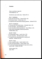 Kolektivní práci jedenácti autorů v redakci anglického muzikologa Nicholase Tilla uvozuje jeho stať o stavu poznání a o současných přístupech k problematice. Následující řada studií, soustředěná do čtyř hlavních okruhů, představuje aktuální badatelskou produkci. Jednotlivé stati jsou věnovány zajímavým aspektům souvisejícím kupříkladu s provozem operního domu jako obchodním artiklem nebo úloze opery v rámci společnosti a státu, problematice zpěvu, hlasu a pěvecké kultury, poetice a vyjadřovacím prvkům tohoto žánru, dramaturgii a formální struktuře a v neposlední řadě recepci děl. Stále atraktivní je téma gender či zkoumání národní identity a na druhé straně exotismu a orientalismu a jejich projevů operním žánru. Obsáhlá bibliografie, smíšený rejstřík.