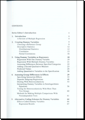 It is often necessary for social scientists to study differences in groups, such as gender or race differences in attitudes, buying behavior, or socioeconomic characteristics. When the researcher seeks to estimate group differences through the use of independent variables that are qualitative, dummy variables allow the researcher to represent information about group membership in quantitative terms without imposing unrealistic measurement assumptions on the categorical variables. Beginning with the simplest model, Hardy probes the use of dummy variable regression in increasingly complex specifications, exploring issues such as: interaction, heteroscedasticity, multiple comparisons and significance testing, the use of effects or contrast coding, testing for curvilinearity, and estimating a piecewise linear regression.