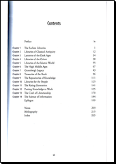 This work describes the crucial role libraries played in ancient Egypt, Han-dynasty China, the ancient Western Classical world (the great library of Alexandria, which was lost to us in stages over many years), the Baghdad of Harun-al-Rashid, and medieval and Renaissance Europe. It continues with the libraries of colonial America, the Library of Congress, university libraries, and today's large public library system.
