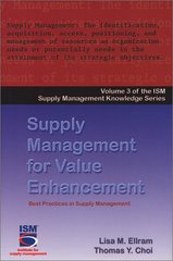 This volume brings emphasis to the variety of ways the suply management process adds value to the organization. This text covers all aspects of value enhancement, well beyond basic cost-saving measures. "Supply Management for Value Enhancement" focuses on the critical issues involved with outsourcing/privatization, inventory management, cost avoidance/cost reduction programs, forecasting, hazardous materials management, JIT inventory systems, lease-buy and net present value analysis, and how to develop strategies based on long- and short-term market forecasts.
