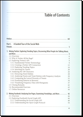 How can you tap into the wealth of social web data to discover who’s making connections with whom, what they’re talking about, and where they’re located? With this expanded and thoroughly revised edition, you’ll learn how to acquire, analyze, and summarize data from all corners of the social web, including Facebook, Twitter, LinkedIn, Google+, GitHub, email, websites, and blogs. Employ the Natural Language Toolkit, NetworkX, and other scientific computing tools to mine popular social web sites Apply advanced text-mining techniques, such as clustering and TF-IDF, to extract meaning from human language data Bootstrap interest graphs from GitHub by discovering affinities among people, programming languages, and coding projects Build interactive visualizations with D3.js, an extraordinarily flexible HTML5 and JavaScript toolkit Take advantage of more than two-dozen Twitter recipes, presented in O’Reilly’s popular "problem/solution/discussion" cookbook format The example code for this unique data science book is maintained in a public GitHub repository. It’s designed to be easily accessible through a turnkey virtual machine that facilitates interactive learning with an easy-to-use collection of IPython Notebooks.