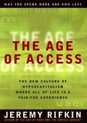 Destined to become one of the most talked-about books of 2000, here is a journey into the new world of hyper-capitalism where accessing experiences becomes more important than owning things and all of life is a paid-for activity.In The End of Work, Jeremy Rifkin argued that computers, robotics, telecommunications, and biotechnologies are fast replacing human beings in virtually every industry and workplace. In The Age of Access, he goes further, showing how new technologies are even eliminating concepts of "property" and "ownership" from our lives. In this new era, we will buy enlightenment and play, grooming and grace, and everything in between in the form of purchased experiences. Imagine a world where virtually every activity outside the confines of family relations is a paid-for experience--a world where traditional reciprocal obligations and expectations are replaced by contractual relations in the form of paid memberships, subscriptions, admissions charges, retainers, and fees.For the first time in modern history, Rifkin argues, ownership of physical property is seen as an albatross, and intangible ideas and expertise are the chief generators of wealth. This dramatic shift affects corporations as much as consumers: the world's major companies are quickly shedding property holdings, factories, and other assets in favor of massive outsourcing and leasing. Rifkin warns of a dawning era in which giant access-providing companies are profiting from every aspect of human existence, while consumers own nothing. In this new economy, access-sellers will finally be able to commidify all of human experience.