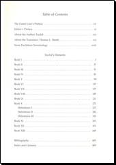 Green Lion Press has prepared a new one-volume edition of T.L. Heath's translation of the thirteen books of Euclid's "Elements" In keeping with Green Lion's design commitment, diagrams have been placed on every spread for convenient reference while working through the proofs; running heads on every page indicate both Euclid's book number and proposition numbers for that page; and adequate space for notes is allowed between propositions and around diagrams. The all-new index has built into it a glossary of Euclid's Green terms.