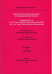 PIPP, Eveline, ed. Dokumente und Datenbanken in elektronischen Netzen: Tagungsberichte vom 6. und 7. Österreichischen Online-Informationstreffen bzw. vom 7. und 8. Österreichischen Dokumentartag : 26.-29. September 1995, Schloß Seggau, Seggauberg bei Leibnitz; 21.-24. Oktober 1997, Congresszentrum Igls bei Innsbruck. Innsbruck: Österreichische Online-Benutzergruppe, 2000, c1999. 194 s. Biblos-Schriften, Bd. 161.