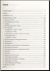 Tato kniha je krátká, jasná referenční práce o formách a použití německých sloves. V seznamu najdete všechna silná a slabá slovesa, která mají zvláštní formální vlastnosti, seřazená abecedně a s informacemi o struktuře vět. Pro každé sloveso se odkazuje na příslušnou slovesnou tabulku, ze které se objevují všechny konjugační formy, časové a modální formy a infinitivní formy příslušného slovesa. Závěrečná část textu na gramatice slovesa popisuje slovesné formy a jejich výskyt v komunikačním kontextu.
