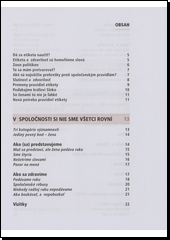 Poskytuje praktické návody, jak se chovat, jak se oblékat, jak správně stolovat a to při běžných i mimořádných společenských událostech, při setkání s významnými osobnostmi, doma i v cizině. Seznamuje s největšími prohřešky vůči společenským pravidlům a radí, jak taktně vyřešit nečekané nehody ve společnosti.