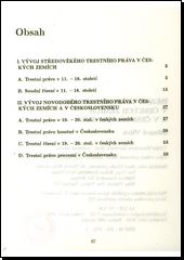 Autor seznamuje s vývojem středověkého práva v českých zemích v období 11. až 18. stol. Novodobé trestní právo v českých zemích a v Československu zahrnuje instituty trestního práva a trestního řízení 19. až 20. stol.