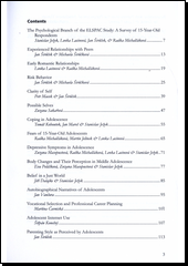 Hlavním záměrem této publikace je představení dat a metod, jimiž byla data vytvořena, v rámci individuálního psychologického šetření patnáctiletých respondentů studie ELSPAC (European Longitudinal Study of Pregnancy and Childhood). Kapitoly představují jednotlivé zkoumané oblasti a seznamují čtenáře s teoretickými východisky při výběru měřícího nástroje. Popisován je i proces adaptace metod zahraniční provenience pro užití v českém prostředí. Zmíněny jsou rovněž výhody daného přístupu, ale i jeho omezení a nevýhody, které vyvstaly při využití jednotlivých metod v rámci longitudinální studie. Po empirické stránce představují studie základní psychometrické charakteristiky použitých metod a popisné statistiky dat získaných těmito metodami.