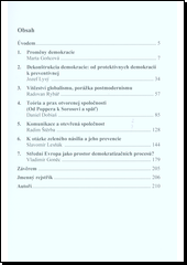 Monografie reflektuje několik problémových okruhů: pojetí evropské demokracie v kontextu migračních vln; demokracie a vývoj politické moci; budoucnost otevřené společnosti, i její využití jako prostoru pro komunikaci. Obecnější zamyšlení nad stavem společnosti a její kultury, hodnot, přináší kapitola věnována globalizaci a postmoderně. Demokracie může být ohrožena i v kontextu eokologické krize (zelené násilí), pokud včas nenastoupí prevence. Poslední kapitola analyzuje pozitiva i negativa demokratizačních procesů ve střední Evropě.