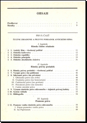 Obsah: Štátne zriadenie a právny poriadok antického Ríma, Rímske štátne zriadenie, Rímsky právny poriadok, Pramene práva. Občianske právo procesné - Subjektívne právo a žaloba, Rímsky občiansky proces, Jednotlivé druhy občianskeho procesu. Osoby - Prirodzené osoby, Právnické osoby. Základný mechanizmus práv a povinností - Právne skutočnosti a právne úkony, Vôľa a jej prejav. Pohnútka. Vecné právo - Pojem a systém vecného práva. Vlastnícke právo, Vecné práva k cudzej veci, Všeobecná charakteristika záväzkov, Jednotlivé druhy kontraktov, Rozšírenie kontraktuálneho systému, Protiprávne úkony, Dedičské právo - Charakteristické rysy rímskeho dedičského práva, Druhy dedenia, Dôsledky nadobudnutia dedičstva, Singulárna sukcesia pre prípad smrti.