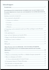 Jedenáct autorů sleduje v kulturní interakce mezi střední Evropou a Nizozemím. L.Beheydt podává interpretaci tzv. vlámských primitivů. M.Potočár konfrontuje význam náměstí SNP v Bratislavě s podobnými ve Vlámsku. J.Novaković a S.Peeters diskutují zprávy v nizozemských a vlámských mediích o atentátu G.Principa v r. 1914. J.Sterckx a I.Németh sledují vnímání emigrantů v Nizozemí, E.Kubátová líčí osud vodohospodáře A.Boota v Mexiku 17. století a G.Pusztai ukazuje, jak maďarský imigrant L.Székely zobrazil ve svých karikaturách koloniální společnost v tehdejší Nizozemské východní Indii. L.Doležilová, W.Engelbrecht a R.Bozzay diskutují vliv nizozemských knih ve střední Evropě. M.Lipnicka ukazuje vliv tzv. Boloňského procesu na školství ve Vlámsku a v Polsku.