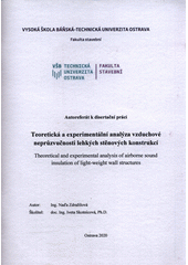 ZDRAŽILOVÁ, Naďa. Teoretická a experimentální analýza vzduchové neprůzvučnosti lehkých stěnových konstrukcí =: Theoretical and experimental analysis of airborne sound insulation of light-weight wall structures : autoreferát k disertační práci. 1. vydání. Ostrava: Vysoká škola báňská - Technická univerzita Ostrava, 2020. 55 stran. [Vědecké spisy Fakulty stavební.] Autoreferáty disertačních prací.