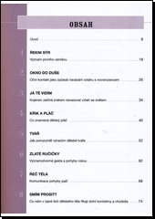 Téměř učebnicový přehled jemných odstínů neverbální komunikace, který vám pomůže pochopit, co chce dítě sdělit, když pláče, usmívá se, vrní, gestikuluje nebo špulí rtíky, a jak na něj co nejlépe r eagovat. Natažený prstík, pohled vzad, nesmělý úsměv vyjadřují slo žité myšlenkové pochody. Rozpoznání signálů, jimiž kojenci sdělují své potřeby, touhy, pocity, preference a nálady, pomůže v komunik aci novopečeným, ale i zkušeným rodičům. Rychlé a správné dešifrov ání řeči kojence je cestou k rodinné spokojenosti