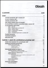 Kniha určená především programátorům se zkušenostmi nastiňuje problematiku programovacího jazyka C#, pomocí něhož lze vytvářet jakékoliv windowsové či webovské aplikace. Obsáhlá publikace je rozdělena celkem do šesti částí, z nichž ta první, po krátké předmluvě a seznámením s architekturou .NET, osvětluje základy jazyka C#. Následující kapitola pak přibližuje programování v .NET, především pak vývojové prostředí Visual Studio .NET, rozhraní Windows Forms a tvorbu vlastních knihoven v podobě sestavení (assembly). Třetí kapitola se zabývá programováním v Internetu, přičemž důraz je kladen na psaní komponent spouštěných na webových serverech. Následující část obsahuje informace o komponentech modelů COM a COM+. Závěr je věnován pokročilému programování v prostředí .NET, mj. zmiňuje tvorbu grafiky v prostředí GDI+, služby systému Windows či zabezpečení a způsob předávání objektu mezi aplikačními doménami, procesy a vlákny.