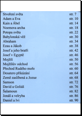 Knížka obsahuje 20 převyprávěných příběhů ze Starého zákona. Pro děti od 5 let.Jednotlivé příběhy jsou psány jednoduchým a srozumitelným jazykem, takže jim porozumí i menší děti. Text je psán většími písmeny. Vhodné i pro začínající čtenáře.