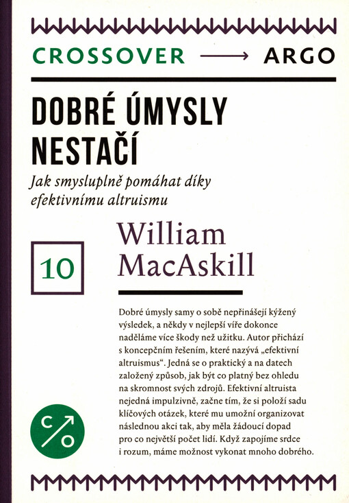 MACASKILL, William. Dobré úmysly nestačí: jak smysluplně pomáhat díky efektivnímu altruismu. Překlad Jan PROKEŠ. Vydání první. Praha: Argo, 2021. 262 stran. Crossover, 10.