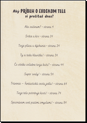 "Tu na svete všetci máme jedno ľudské telo. Prečítaj si teda, ako by správne fungovať malo!" V krátkych veršovaných príbehoch postupne odhalíte tajomstvo fungovania ľudského tela. Môžete si ich predčítať nahlas a vďaka krásnym ilustráciám tak pochopiť zložitosť fungovania ľudského tela aj jeho anatómiu. Príbehy z tejto knižky je najlepšie čítať nahlas. Na každý postačí päť minút. V každom z nich čaká rozprávanie o niektorom zo zázrakov biológie človeka… Zakaždým sa dozviete niečo nové o tom, ako telo vnútri vyzerá a čo sa v ňom odohráva! Táto kniha iste poteší malé i veľké zvedavé hlavičky!