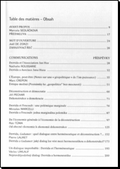 Publikace obsahuje příspěvky přednesené na francouzsko-česko-slovenském kolokviu, které na počest francouzského filosofa Jacquesa Derridy uspořádal v březnu 2005 Filosofický ústav AV ČR. Autoři příspěvků (M. Crépon, J. Fulka, M. Goldschmit, P. Lauret, M. Marcelli, J. Pechar, M. Škop, E. Tardivelová, P. Tůma, V. Umlauf) se zabývají Derridovým dílem v kontextu současného společenskovědního a právního myšlení. Všechny příspěvky jsou vydané dvojjazyčně, tzn. v českém (příp. slovenském) a francouzském jazyce).