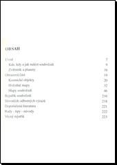 Přehled kosmických objektů (hvězdy, obři a trpaslíci, dvojhvězdy a proměnlivé hvězdy, mléčná dráha, hvězdokupy a mlhoviny, galaxie). Hvězdné mapy souhvězdí v okolí severního světového pólu, podzimní, zimní, jarní a letní souhvězdí a souhvězdí v okolí jižního světového pólu. U map souhvězdí je popis, zajímavosti z historie a dokumentární fotografie. V celé knize jsou označeny odstavce pro začínající pozorovatele hvězdné oblohy. Připojen slovníček odborných výrazů.