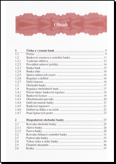Kniha seznamuje s bankovní soustavou České republiky a s postavením České národní banky v ní, se zásadami hospodaření obchodní banky. Další kapitoly jsou věnovány tuzemskému i zahraničnímu platebnímu styku, úvěrovým operacím a operacím bank na finančních trzích. Kromě podstaty tradičních bankovních produktů, jako jsou běžný a vkladový účet, šeky či poskytování úvěrů, vysvětluje kniha i principy homebankingu, telefonního a internetového bankovnictví. Poslední kapitola je věnována mezinárodním měnovým a finančním institucím. Většina podkapitol přináší kontrolní otázky k probranému učivu. Kniha je provázena ukázkami bankovních produktů (např. směnek) a matematickými příklady k vypočtům úroků z úvěrů a doplněna předmětovým rejstříkem.